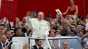 On his way to the palace, he rode through the streets past multitudes of cheering fans and onlookers in an open Pope mobile.