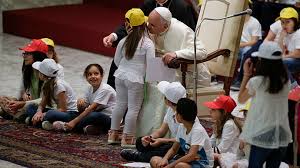 Pope Francis kisses a child during an audience with the boys and girls of the